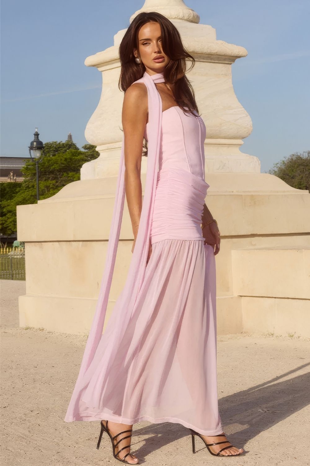Le corsage, sculpté avec précision, dévoile une silhouette élancée tout en célébrant la liberté des épaules nues. Le rose pastel, tendre et raffiné, évoque les jardins au printemps et la douceur des soirs parisiens. La taille se pare de drapés délicats qui affinent et structurent, tandis que le bas en voile léger joue avec la transparence pour un effet aérien irrésistible. La longue étoffe qui s’enroule au cou et retombe en cascade dans le dos ajoute un geste théâtral, presque cinématographique. Parfaite pour une soirée élégante, un mariage ou un dîner romantique, cette pièce se marie à merveille avec des sandales à talons fins, un bijou doré ou une pochette discrète. C’est une tenue qui ne se contente pas de vêtir : elle raconte une histoire de douceur et de confiance, celle d’une femme qui attire les regards par son assurance autant que par son élégance.