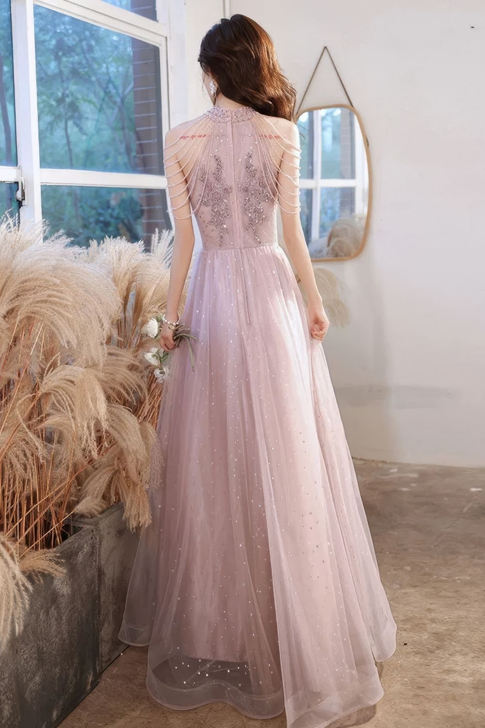 Telle une création échappée d’un rêve raffiné, cette robe longue déploie un tulle délicat parsemé de micro-scintillements, comme un ciel d’été piqueté d’étoiles. Son col montant, subtilement orné, s’ouvre sur un jeu de fines chaînettes perlées qui embrassent les épaules, tel un bijou cousu sur la peau. Le buste, riche de broderies florales minutieuses, se fond dans une jupe vaporeuse qui ondule avec fluidité à chaque pas. Le rose poudré, doux et flatteur, évoque la tendresse des pétales de pivoine au matin, tandis que sa brillance discrète lui confère un charme théâtral sous les lumières du soir. Idéale pour un mariage, un gala ou un bal, elle se marie à merveille avec des escarpins argentés, une pochette satinée et un maquillage aux tons lumineux. Elle n’habille pas seulement un corps : elle sublime une allure, raconte une histoire, signe un instant inoubliable.