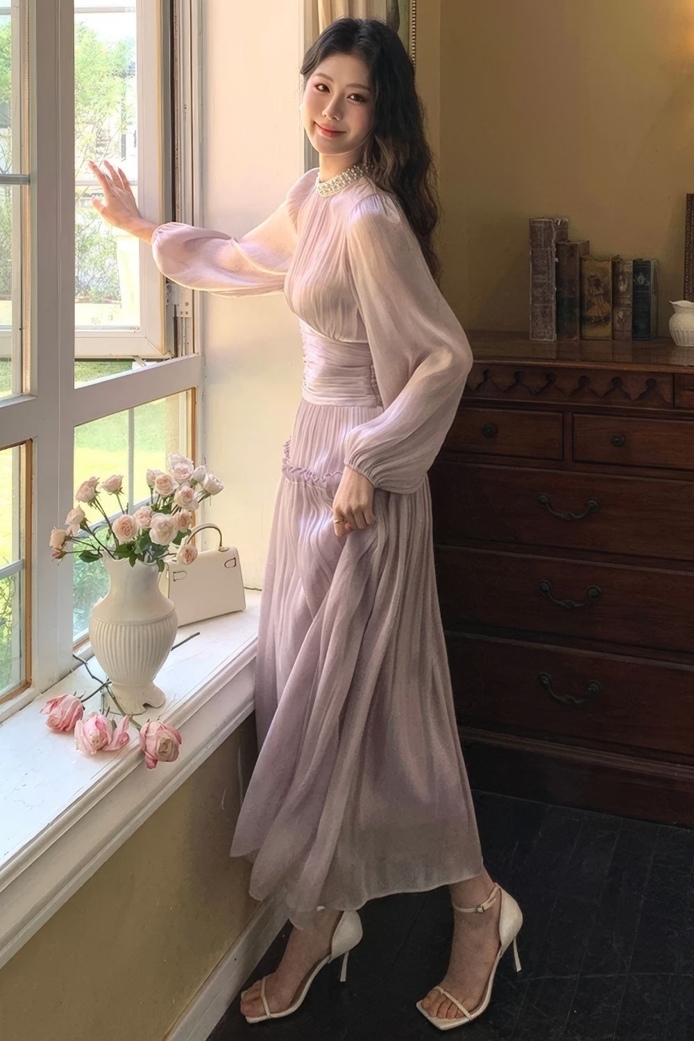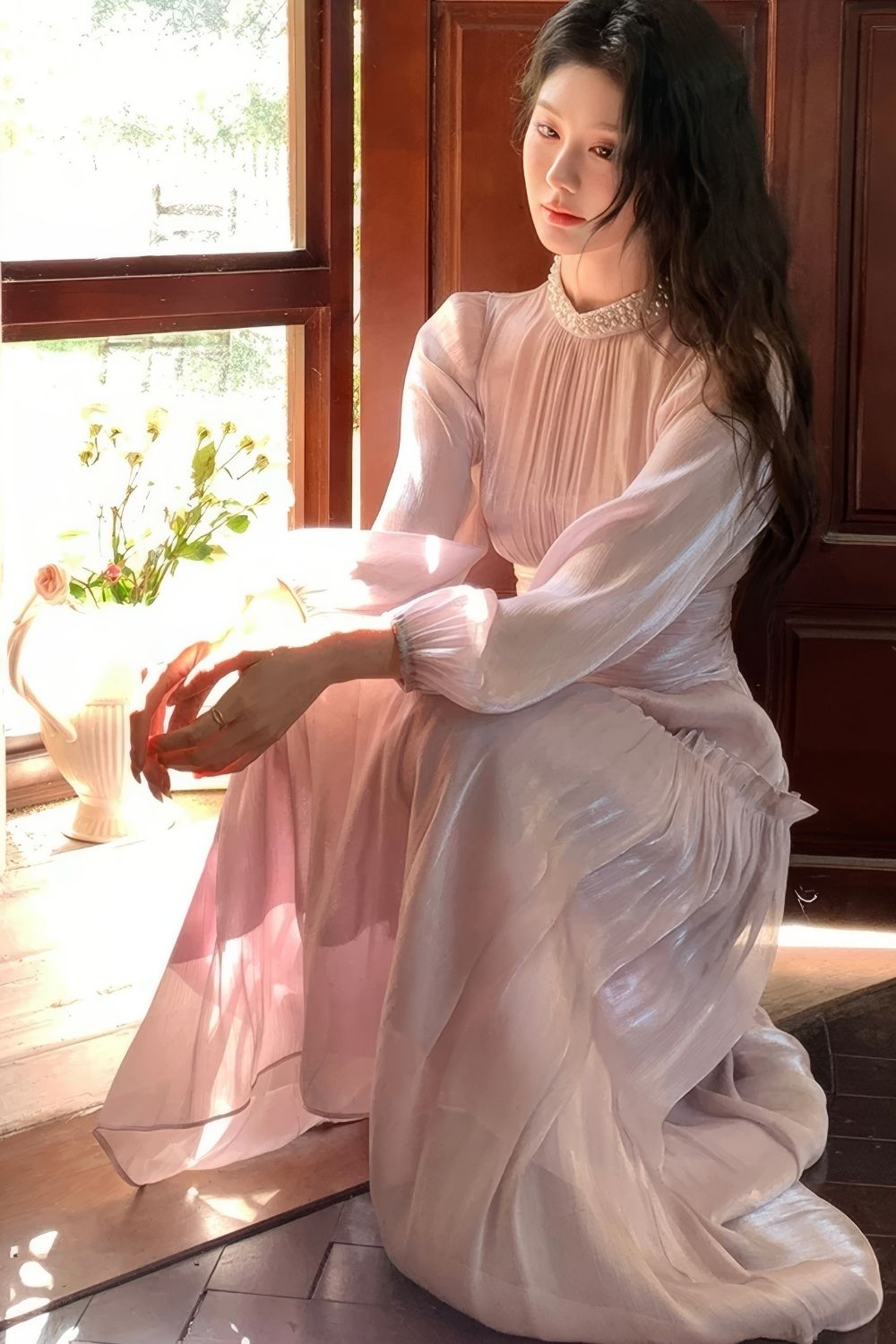 Tissée dans un polyester fluide au tombé impeccable, cette robe longue dessine une silhouette délicatement sculptée : buste plissé qui épouse les formes avec grâce, taille marquée par un drapé savamment travaillé, manches bouffantes qui effleurent l’air avec majesté. La jupe, ample et plissée, ondule comme une vague de douceur, tandis que le col rond, serti de perles, apporte un éclat digne des réceptions les plus distinguées. Sa teinte rose poudré évoque les jardins au petit matin, les roses encore perlées de rosée, et porte en elle tout un héritage romantique. Elle se prête aux bals de fin d’été, aux mariages champêtres, aux dîners aux chandelles, mais aussi à ces moments où l’on veut simplement se sentir splendide. Mariée à des escarpins ivoire, une pochette nacrée ou un chapeau léger, elle devient pièce maîtresse d’un style à la fois raffiné et intemporel.