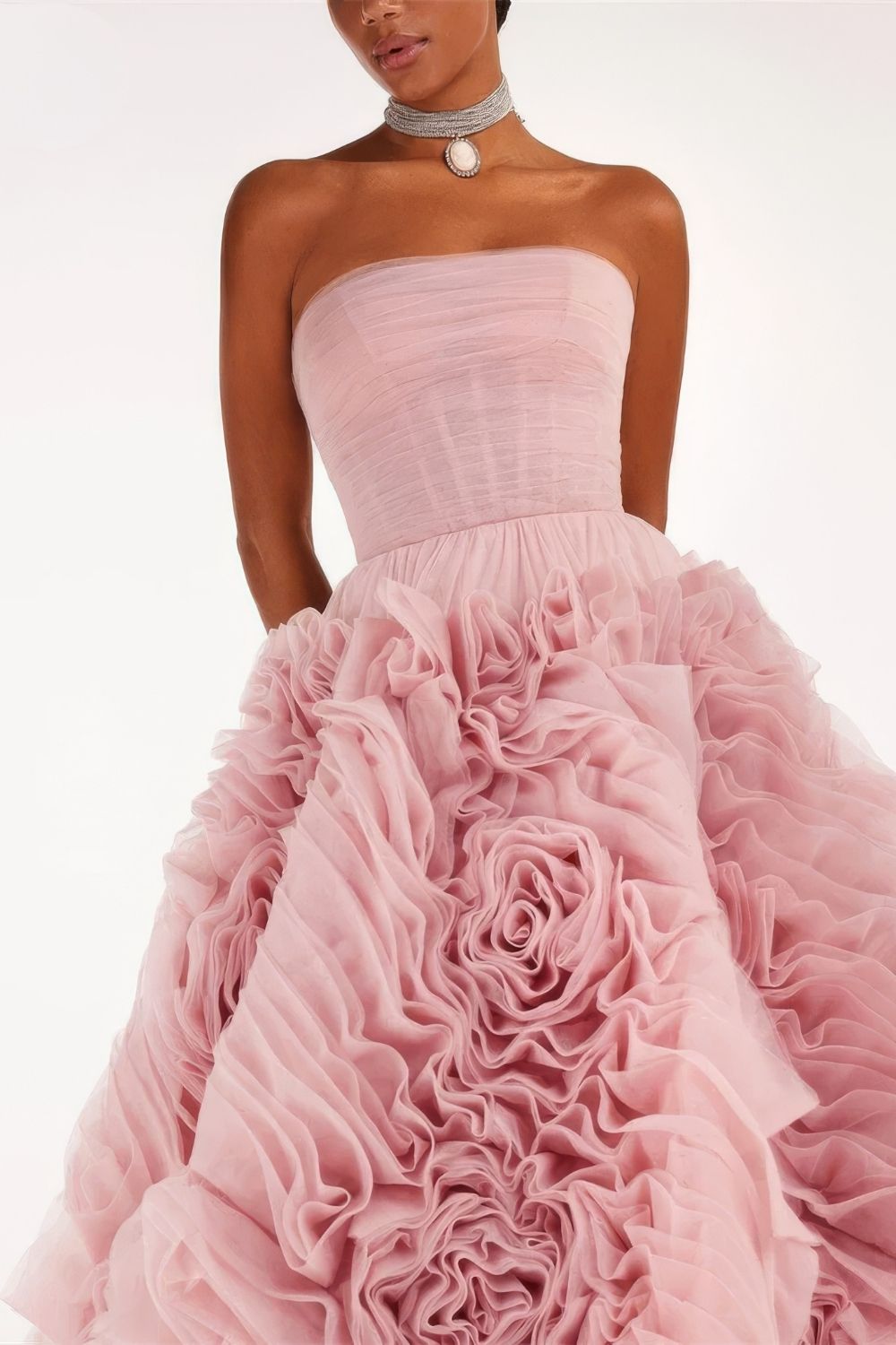 Ce bijou textile s’habille d’un rose tendre, nuance veloutée qui flatte la lumière et caresse le regard. Le bustier, épuré et droit, enlace la silhouette avec la précision d’un corset d’atelier, puis libère la jupe dans une déferlante de tulle soyeux. Les reliefs sculptés évoquent de gigantesques roses en pleine floraison, prêtes à s’ouvrir au premier pas. On la devine née pour les soirées où l’on veut briller avec grâce, pour les mariages où l’on frôle l’allée comme une apparition, ou encore pour les séances photo où la mode devient art. On l’accompagne volontiers d’un ras-du-cou scintillant, d’escarpins argentés ou nude, et d’une pochette fine. Sa construction, alliant polyester, coton, nylon et lycra, promet confort, tenue impeccable et liberté de mouvement — même au cœur d’un quadrille effréné.